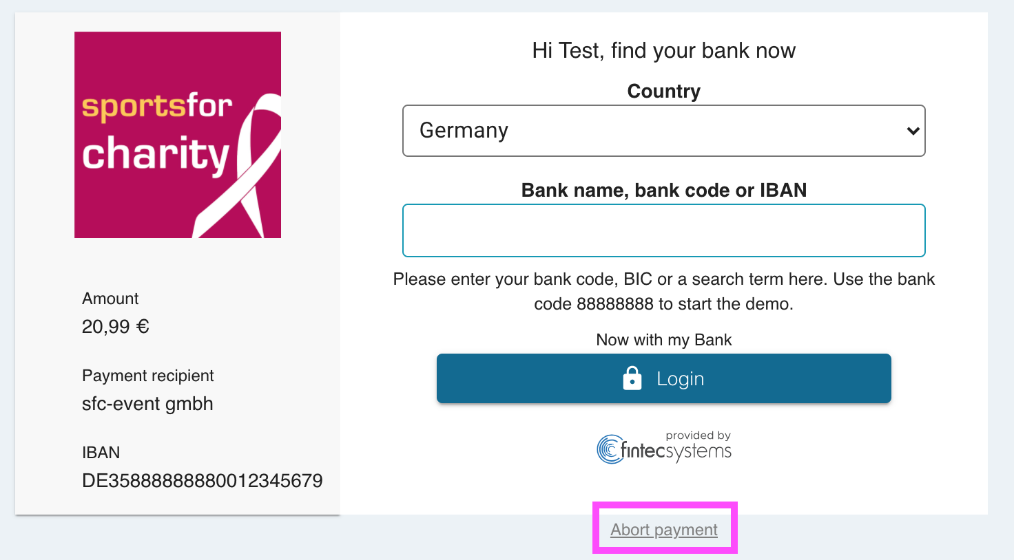 The debitor intentionally clicks the "Zahlung abbrechen" link below the payment form.