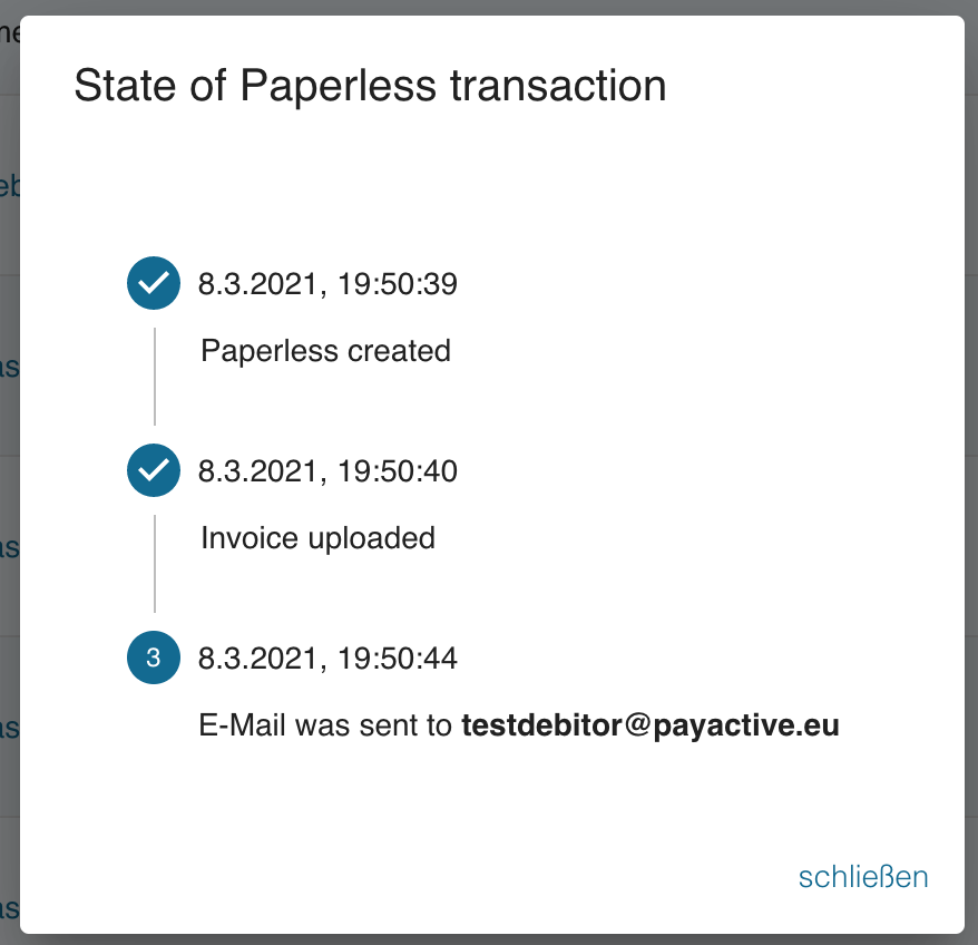Click on "Create" and you will see that the Paperless transaction was created. The state Pending suggests that the transaction is waiting for payment.