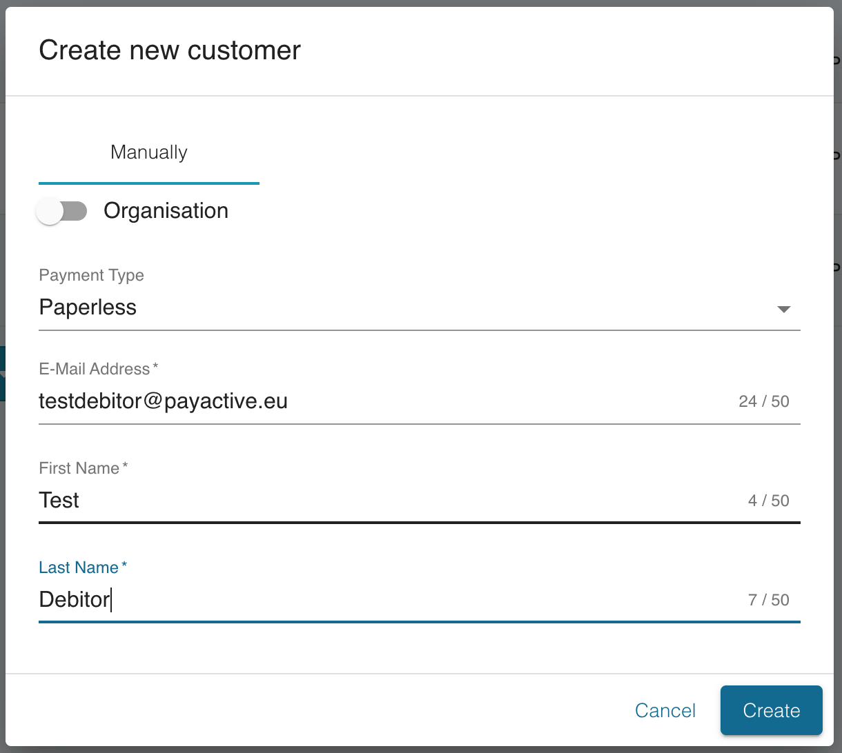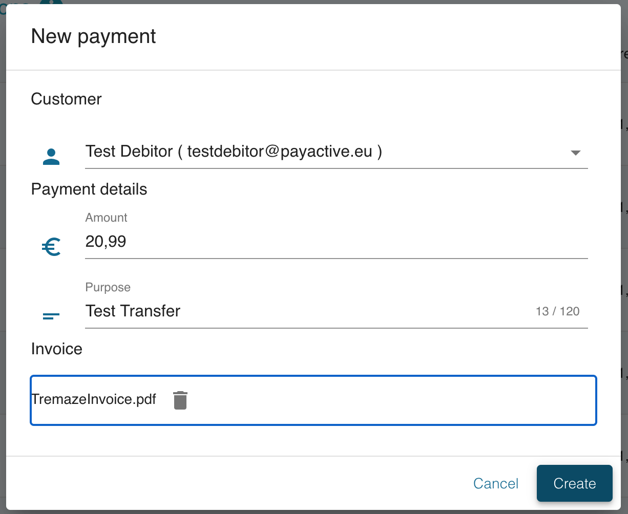 Go to Payments and click on "New payment". Then complete the form using the customer we just created and your own test data.