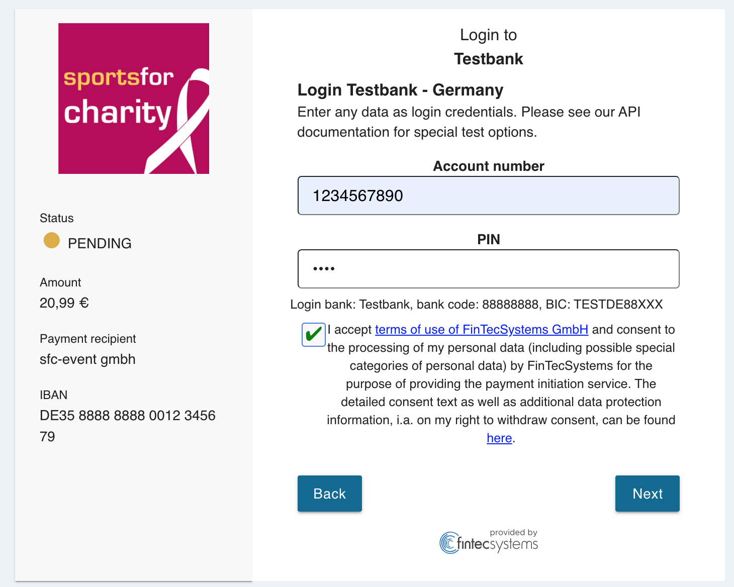 Authorise the payment by providing your 2nd factor (in Sandbox environment this is just a 4 digit code that is displayed).
