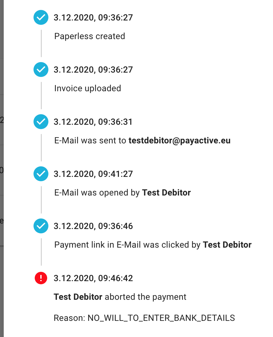In the Actions column click on the three dots -> Events. You will see that an EMail was sent out to the debitor.