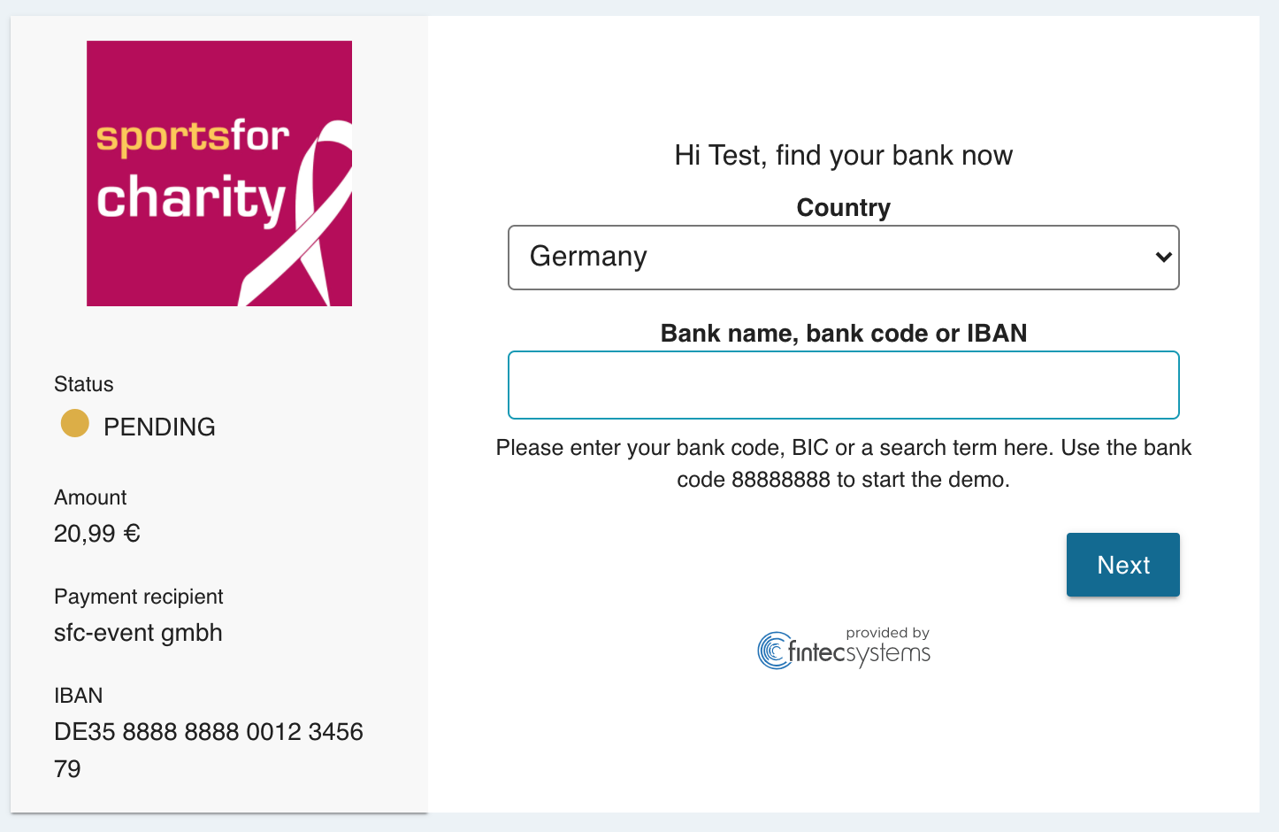 First select your bank. The form autocompletes once you start typing the bank name or identifiers such as IBAN or BLZ.