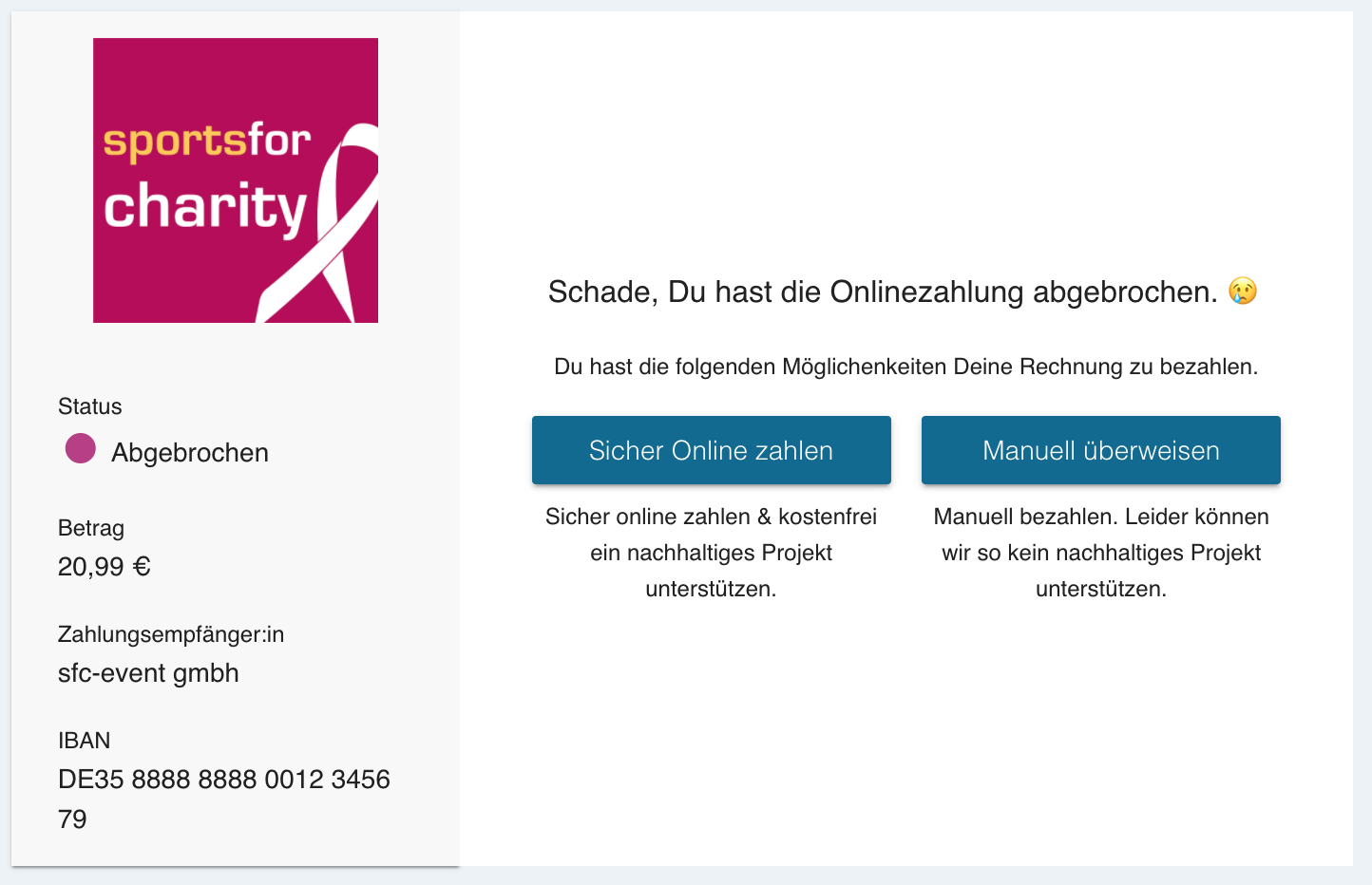 In the previous step you learned how a customer can cancel a payment. They can now make the decision to return to online payment or to make a manual transfer.