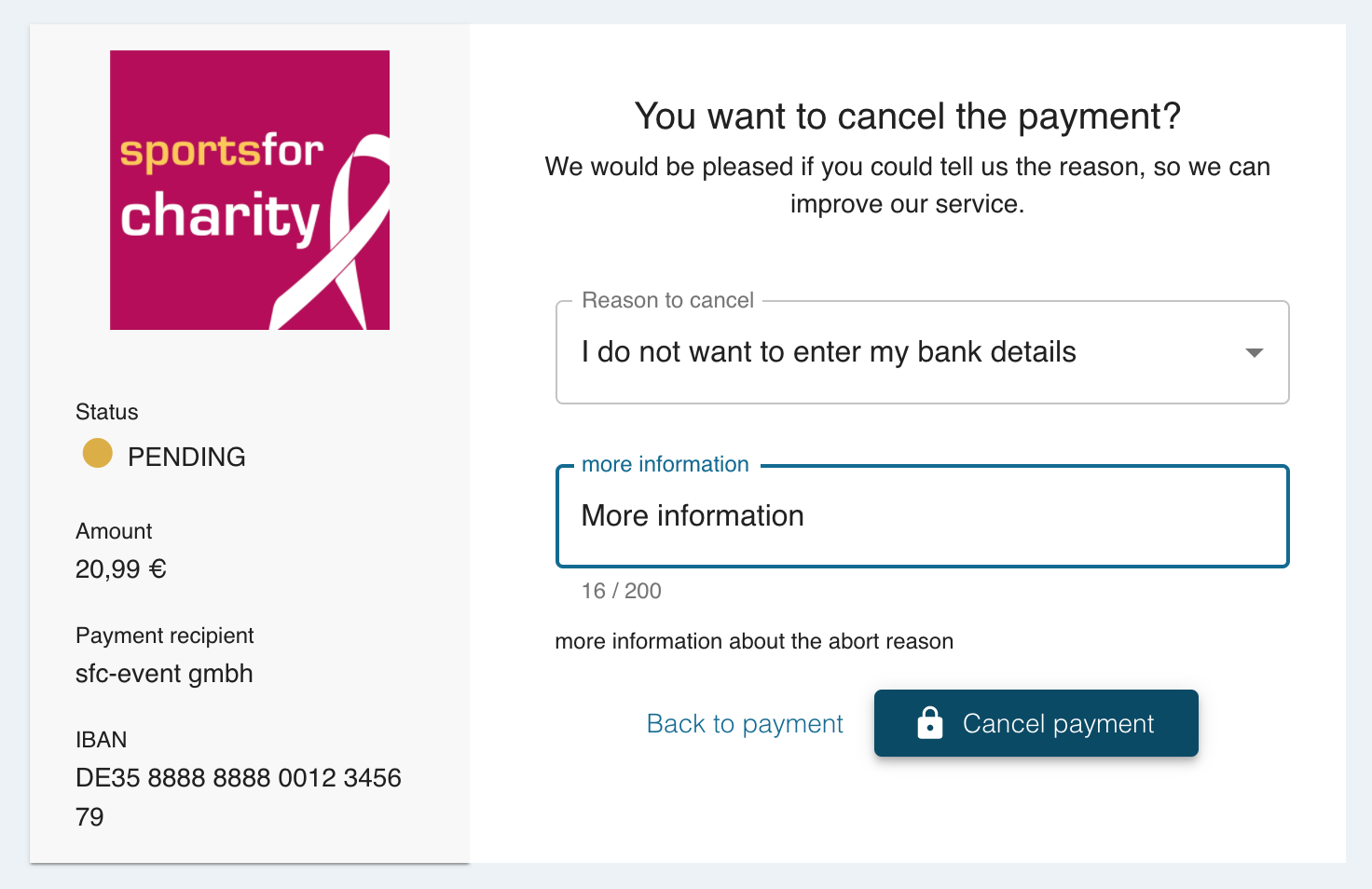 Select a pre-defined reason or enter a custom message, then Click "Zahlung abbrechen"