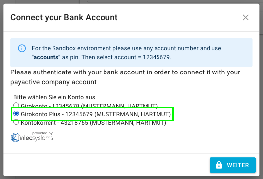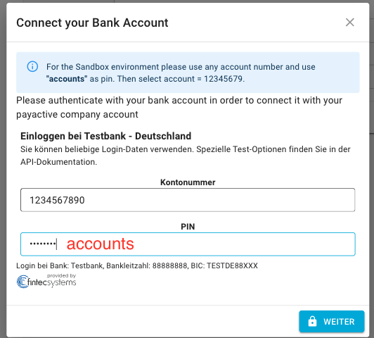 Click on "Weiter". After the validation the account should be visible. In this case you will see the test credentials from the bank account.