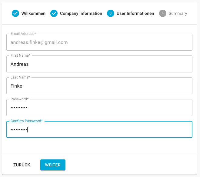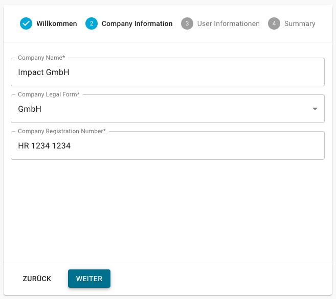 Complete your user information. This is the user that will be able to manage the company account. Click on "Weiter".