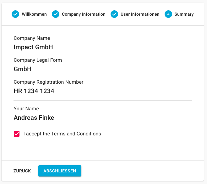 Finally you will be presented with a summary of the information you provided. Accept the terms and conditions and click on "Abschließen".